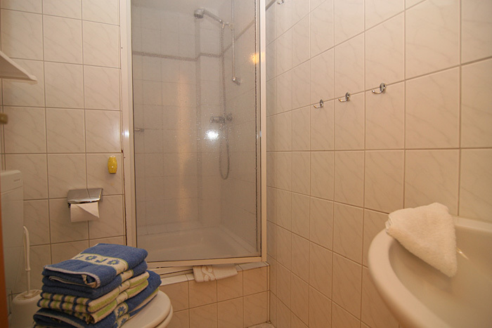 Im Bad gibt es eine Dusche , WC und Handwaschbecken.